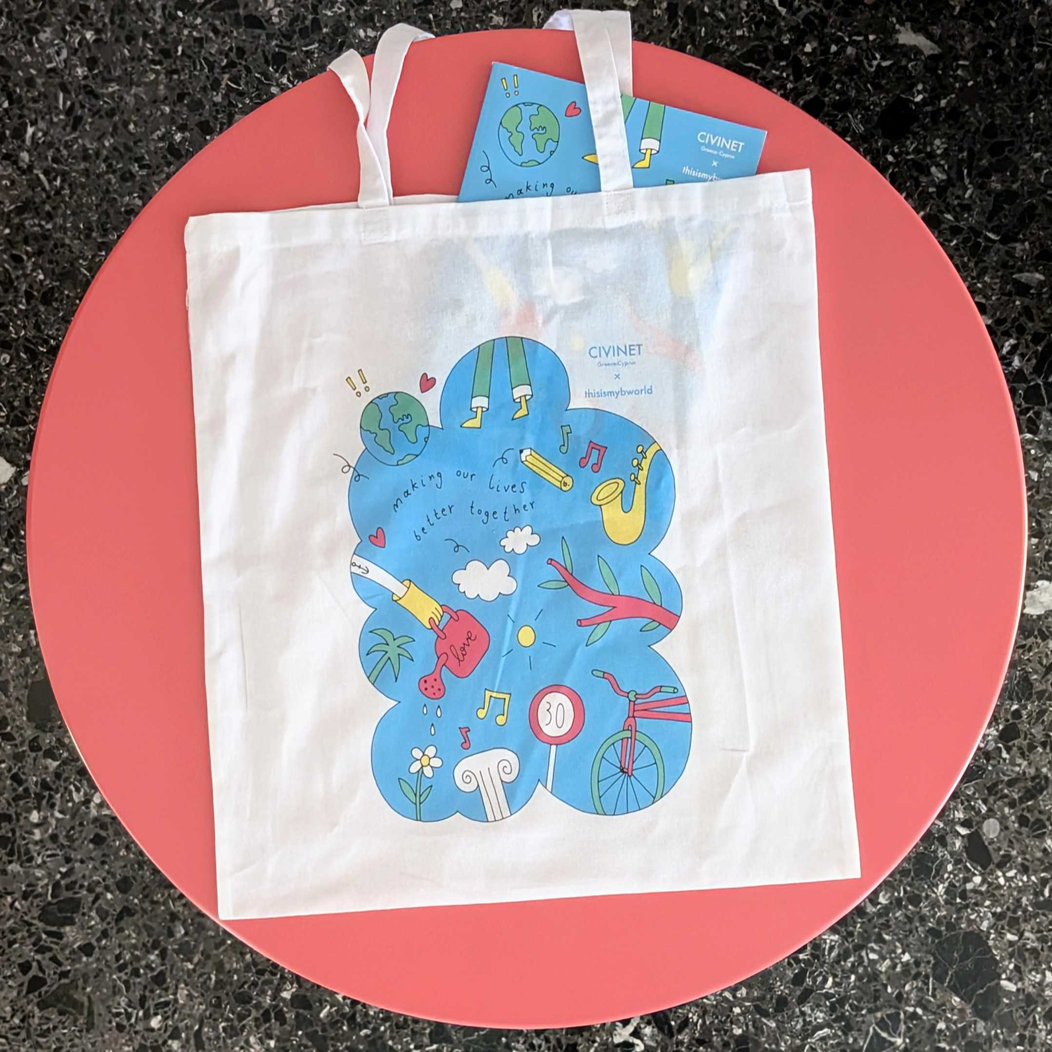 The unisex tote bag of Outta Climate Festival is a unique item produced in a limited number of pieces, designed by the world famous Greek multidisciplinary artist “.b” exclusively for this festival. The picture of the product is being painted on the asphalt of the streets around schools aiming for road safety and raising awareness, through a technique which is called “Asphalt Art” and is better known through successful implementations in Latin America and the USA.
